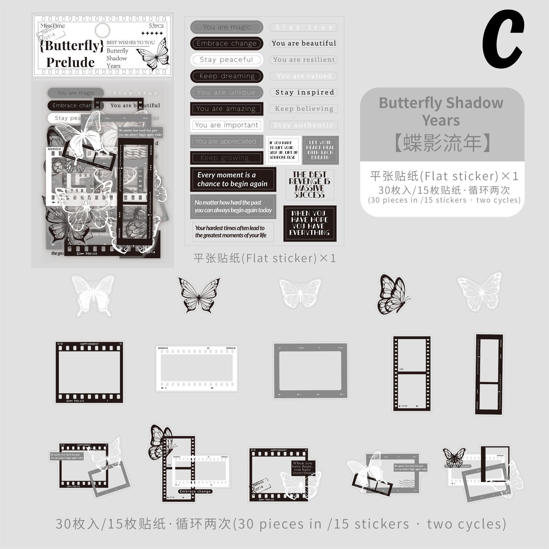 モノクロの蝶とフィルムや切手、フレームなどのデザインのシールです。