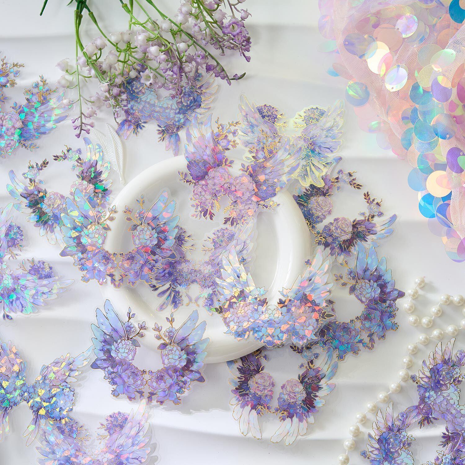 美しい翼にお花がついた綺麗なシールです。