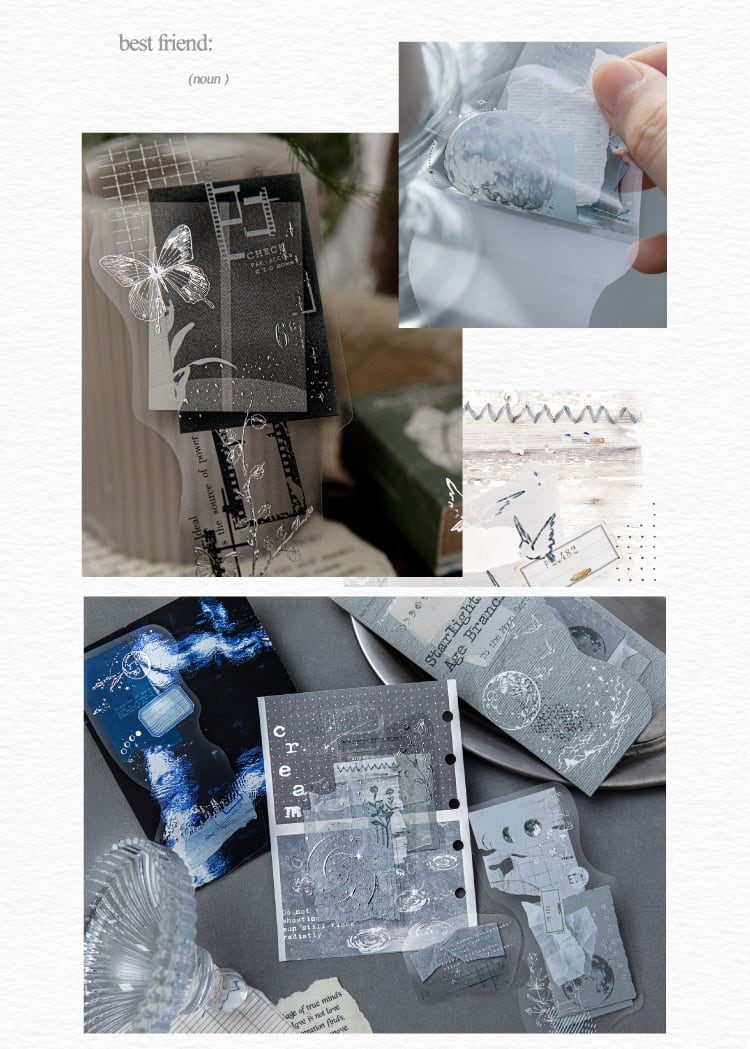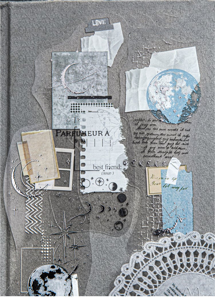 繊細な線の惑星とコラージュ風のデザインが美しい大きめシールです。