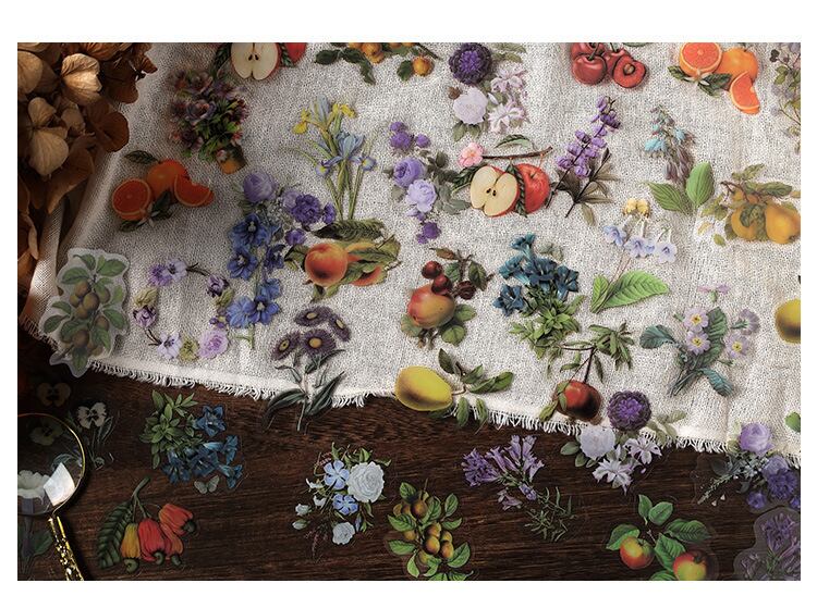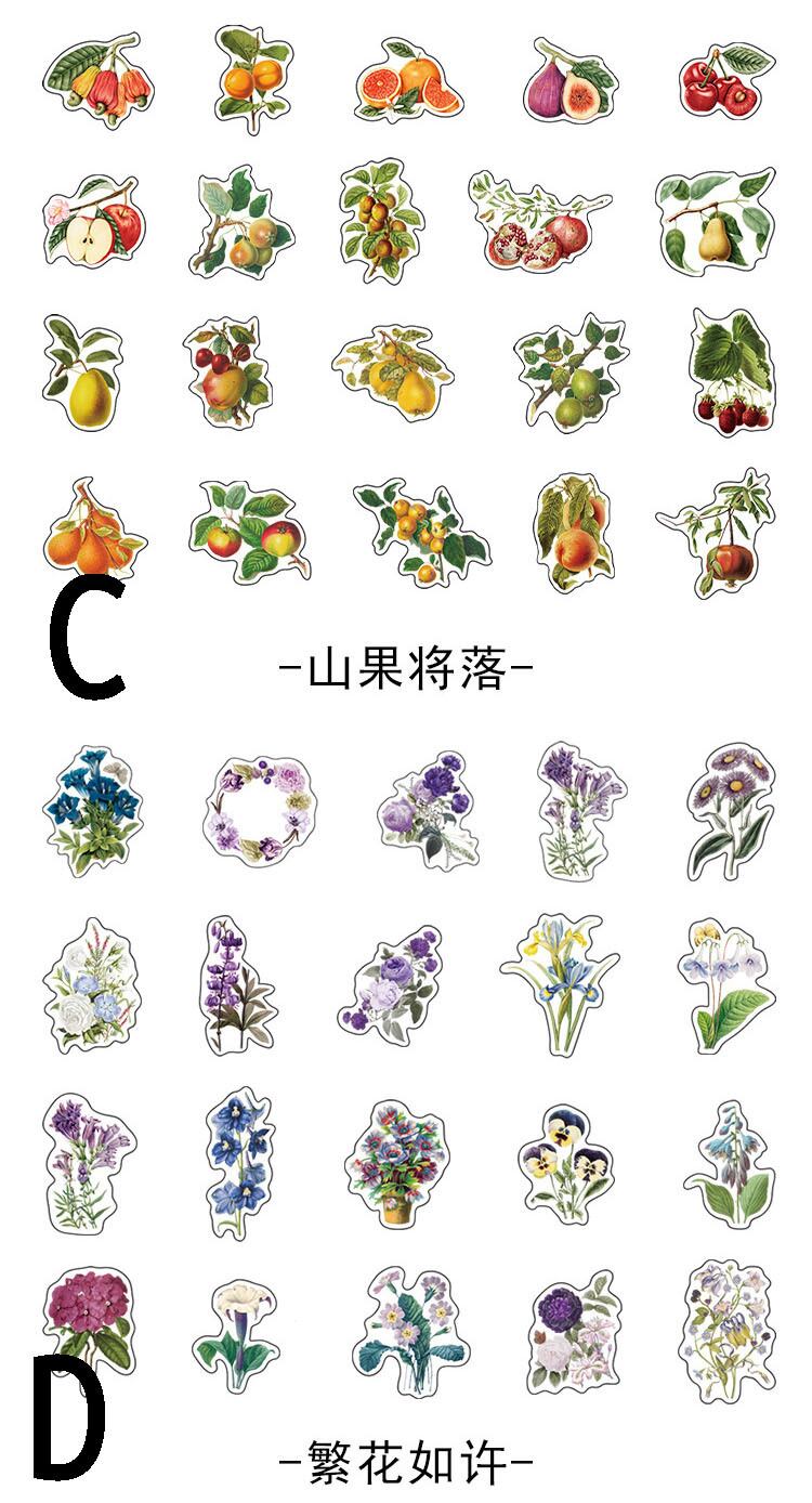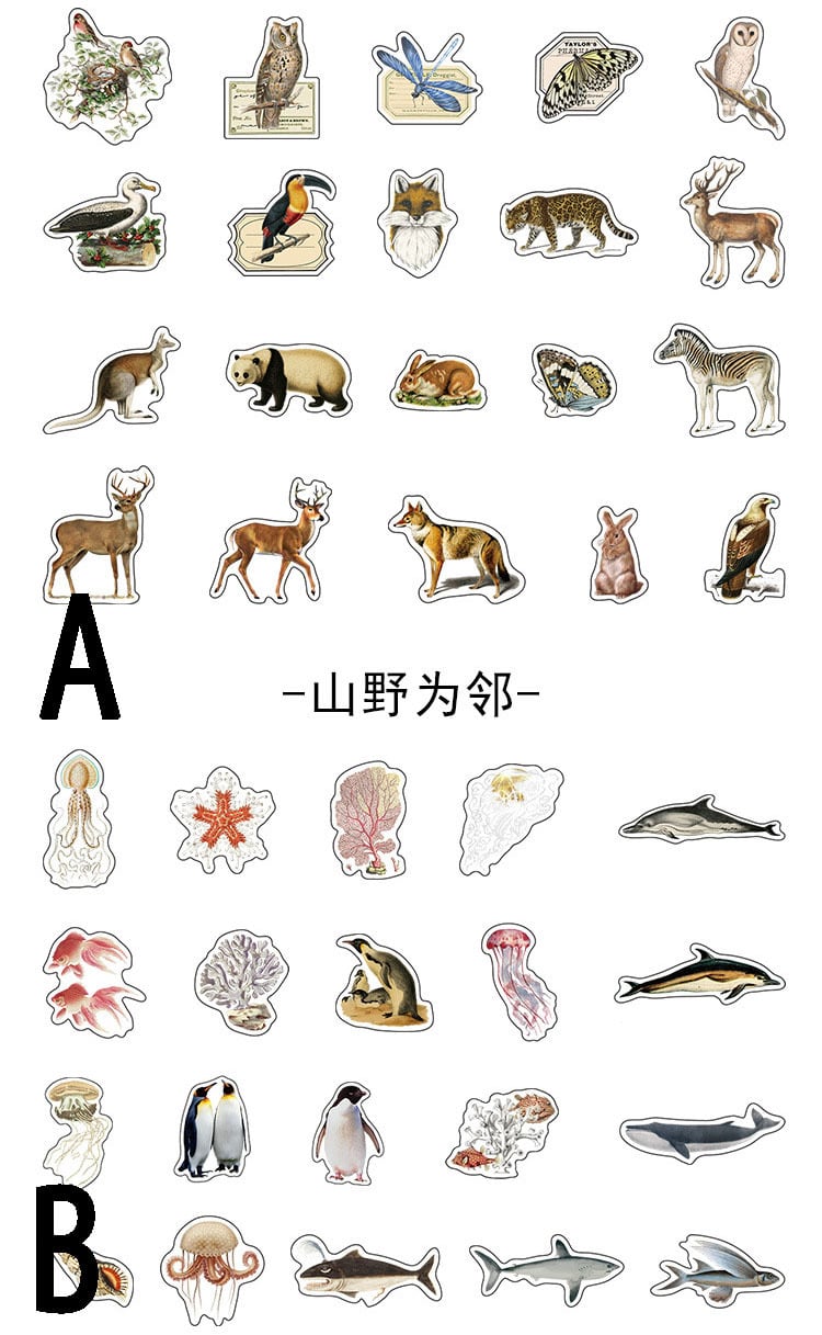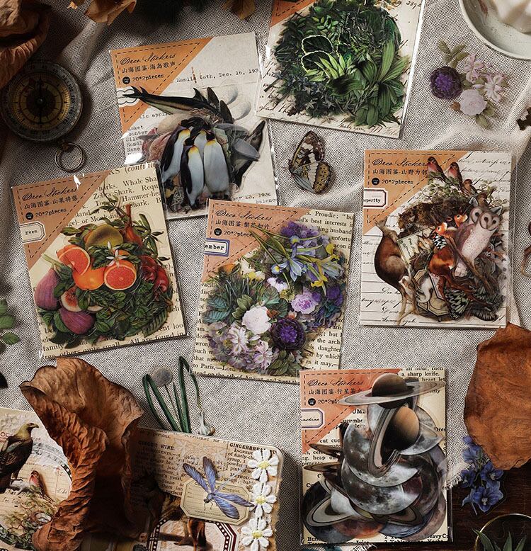 レトロな雰囲気の動物や植物のPET素材ステッカーです。