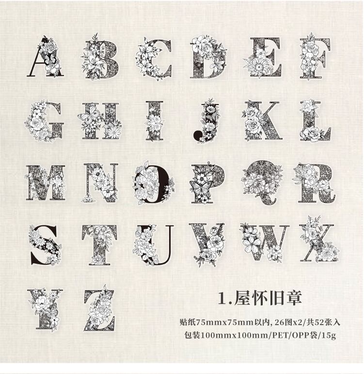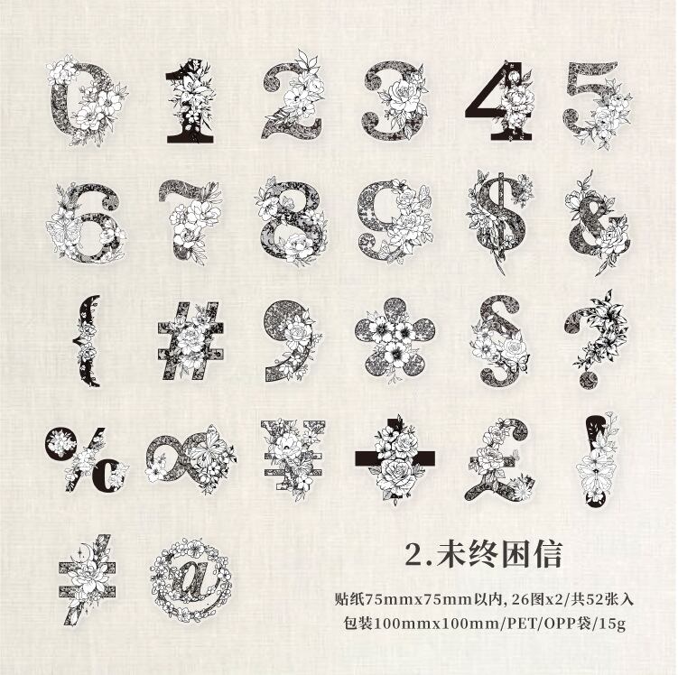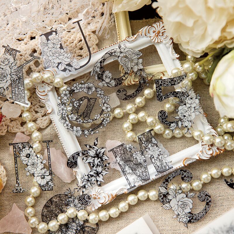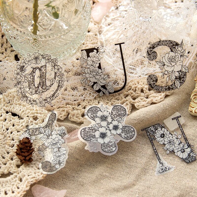 モノクロとお花の装飾がきれいな数字とアルファベットのシールです。