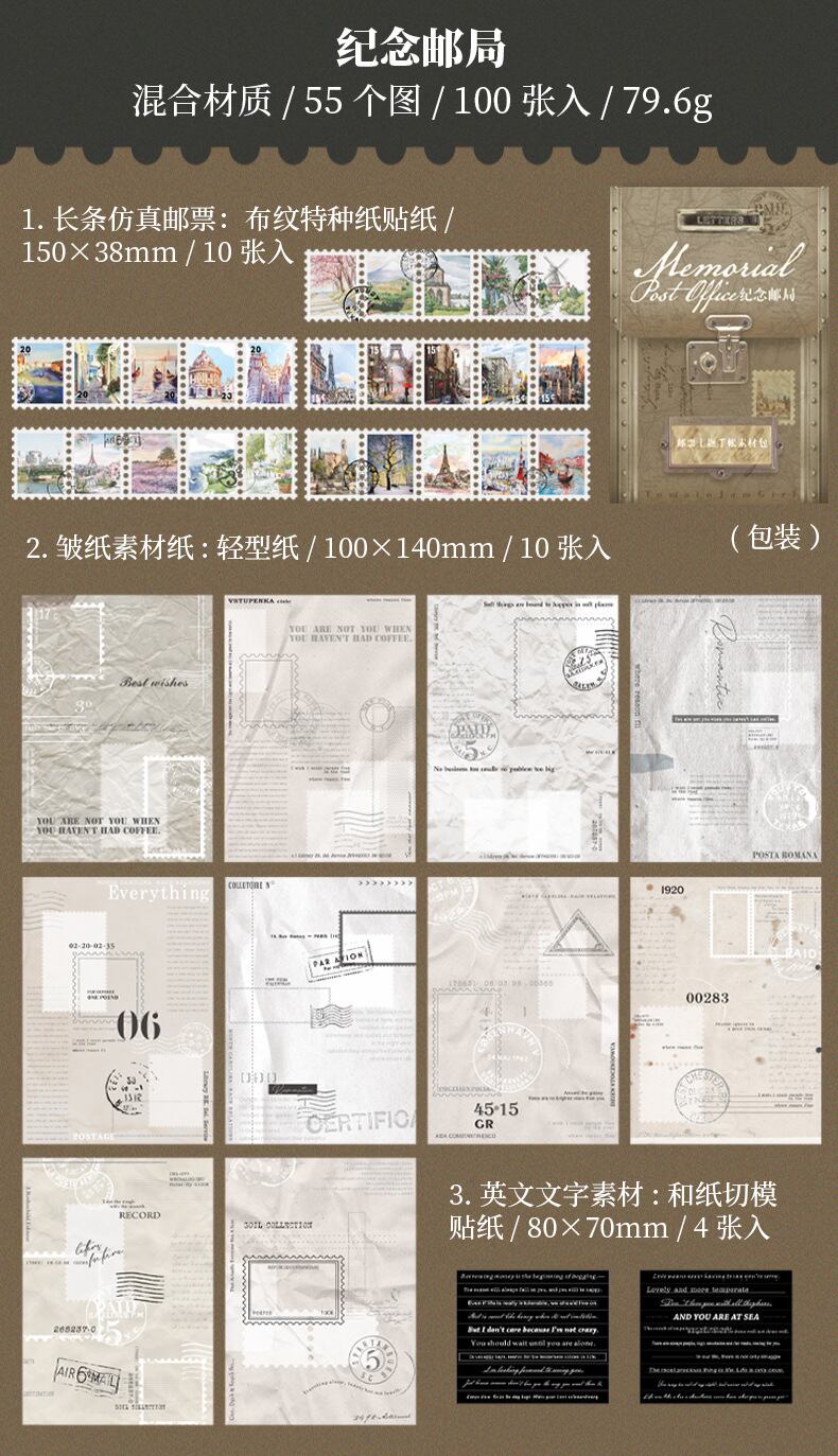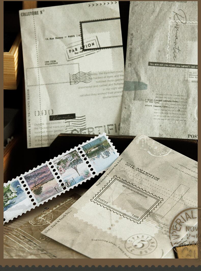 レトロな雰囲気の切手のデザインなどのシールやペーパーのセットです。