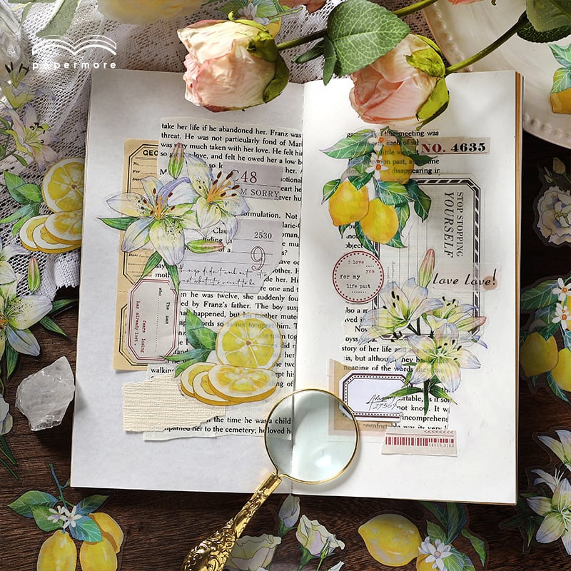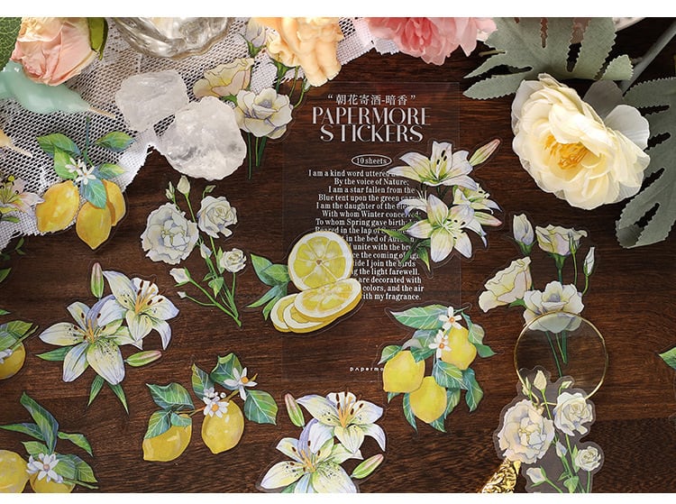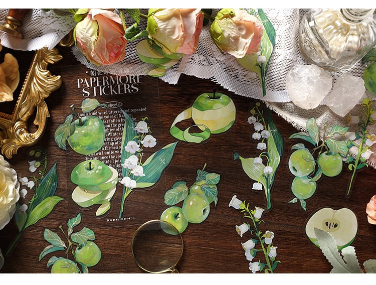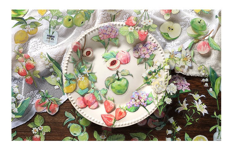 鮮やかな色合いとフルーツとお花がかわいいシールです。