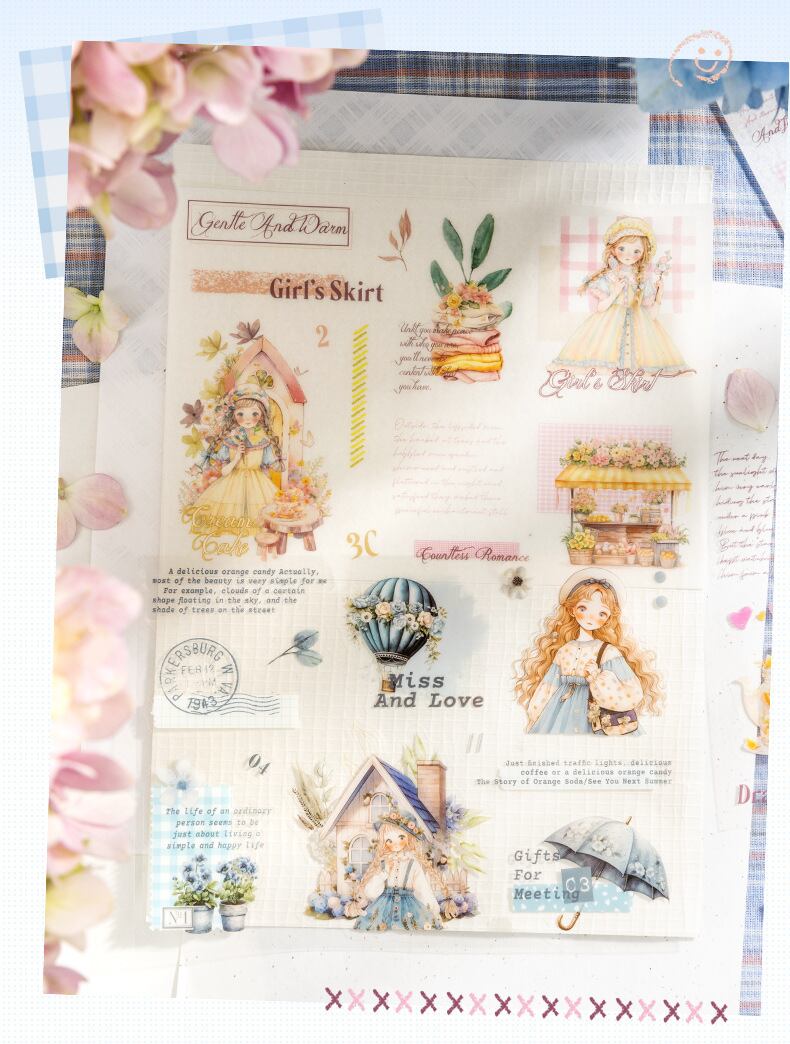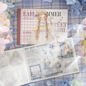 柔らかい色合いのかわいい女の子と小物や家具、英文などのシールブックです。