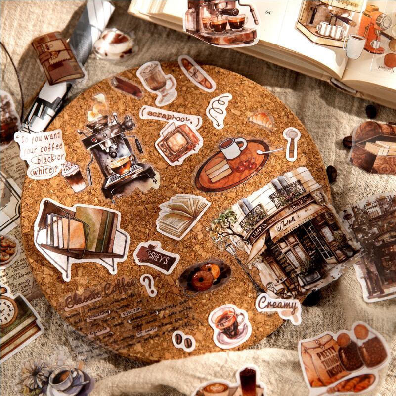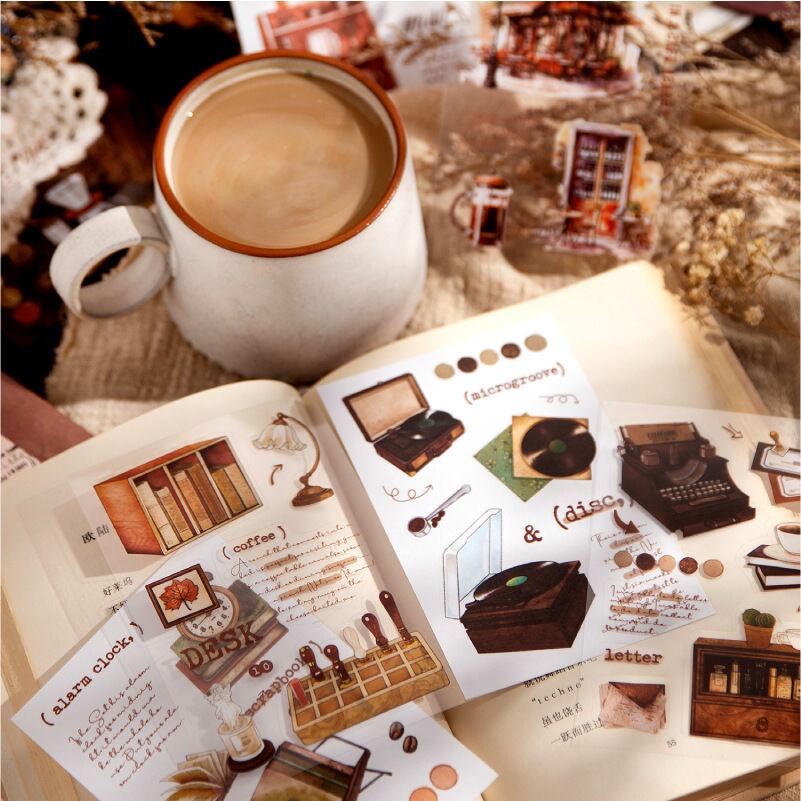 かわいくておしゃれなカフェや小物、食べ物などのシールシートのセットです。
