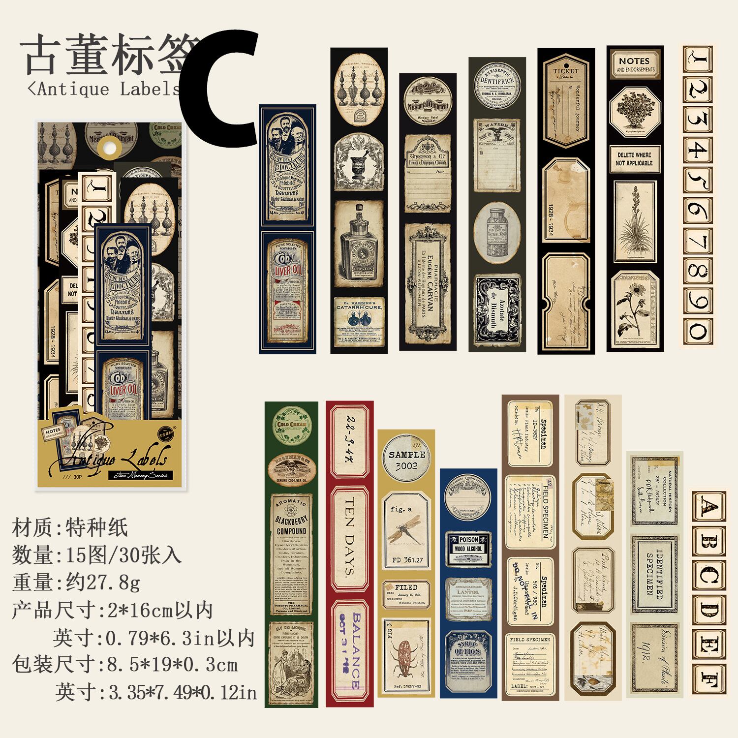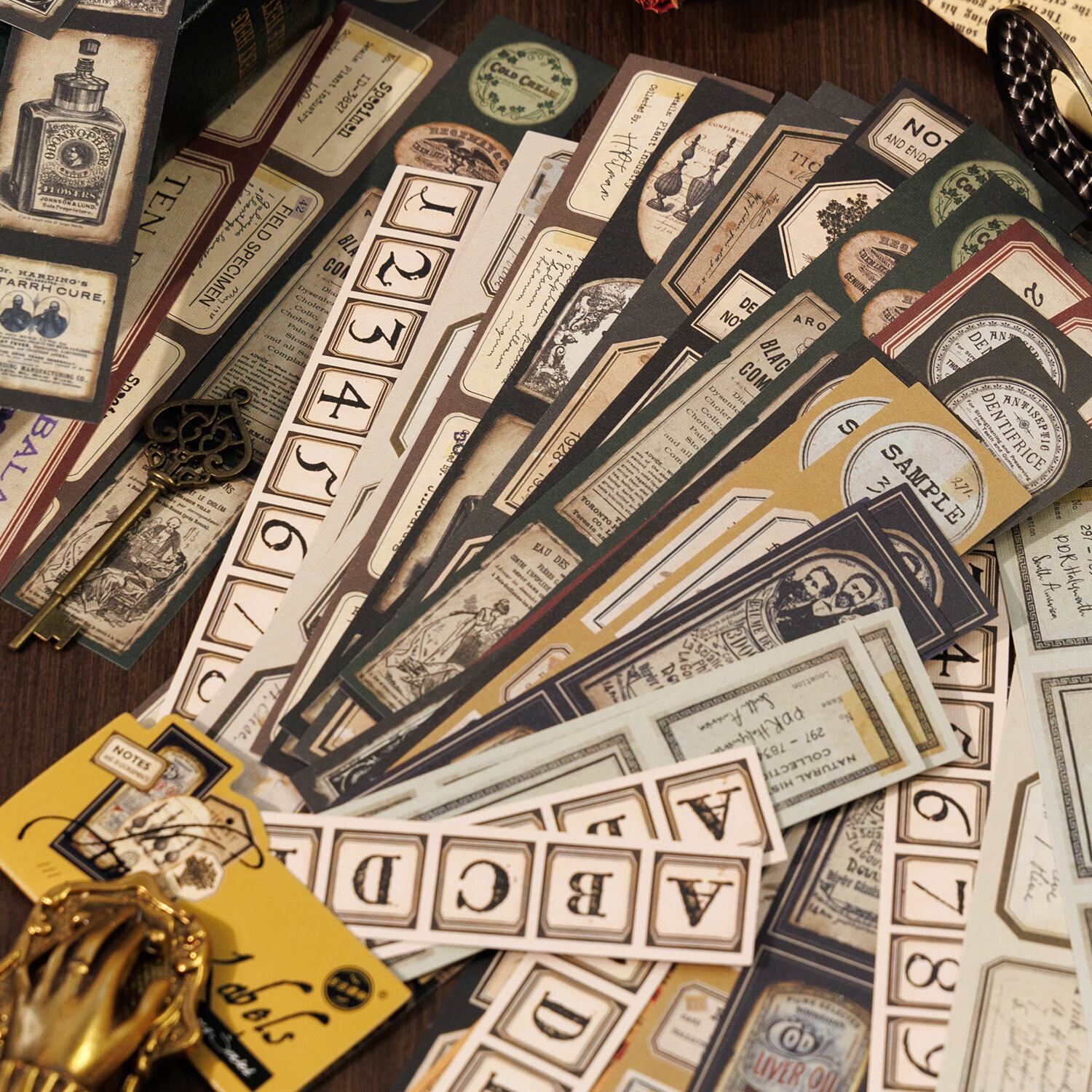 アンティークなデザインの細長いシールです。
